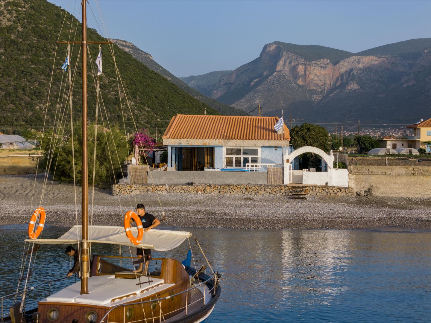 Das Nanita Beach House befindet sich an der Südküste Kynourias, etwa 3 km von Leonidio und nur 700 m vom kleinen, charmanten Hafen Plaka entfernt. Im Hintergrund erhebt sich der imposante Bergrücken des Parnon-Gebirges.