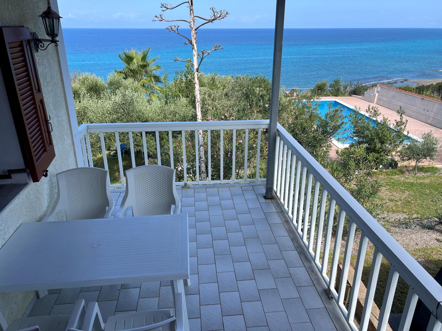 Die einfach eingerichtete Eckwohnung Ithaka 1 verfügt über einen überdachten Balkon mit schönem Blick auf das Meer und den Garten mit Pool. Von der Wohnküche aus gelangt man zu den beiden Schlafzimmern und dem Bad. Vom Pool aus betrachtet, liegt die Wohnung an der linken Ecke. Bei einer Belegung mit 6 oder 7 Personen steht zusätzlich das mittlere Studio mit separatem Eingang zur Verfügung. Das Studio bietet ein Schlafzimmer, ein Badezimmer und eine kleine Wohnküche.