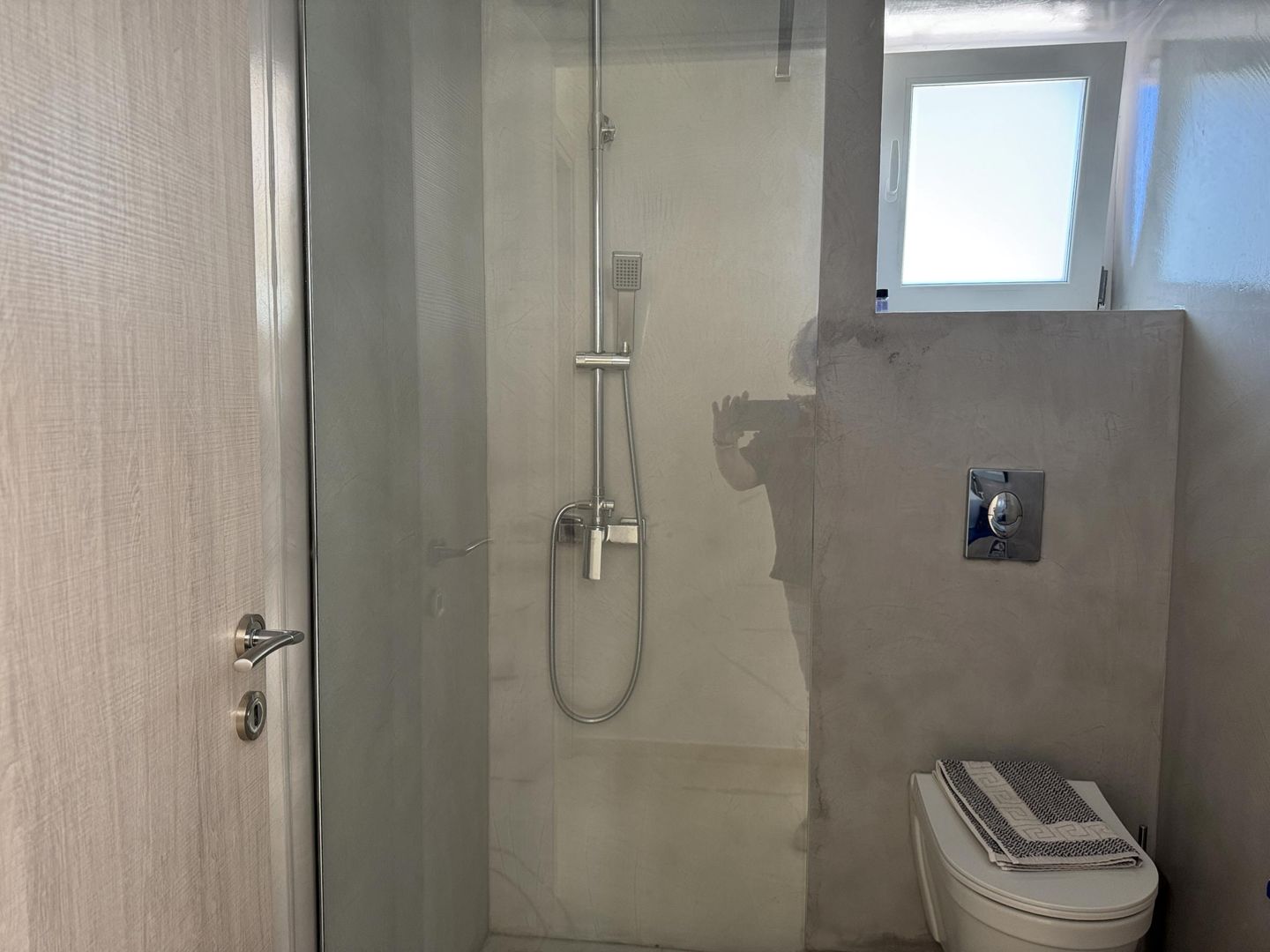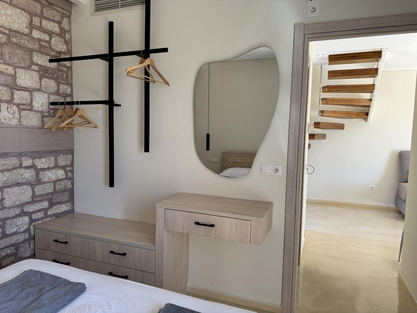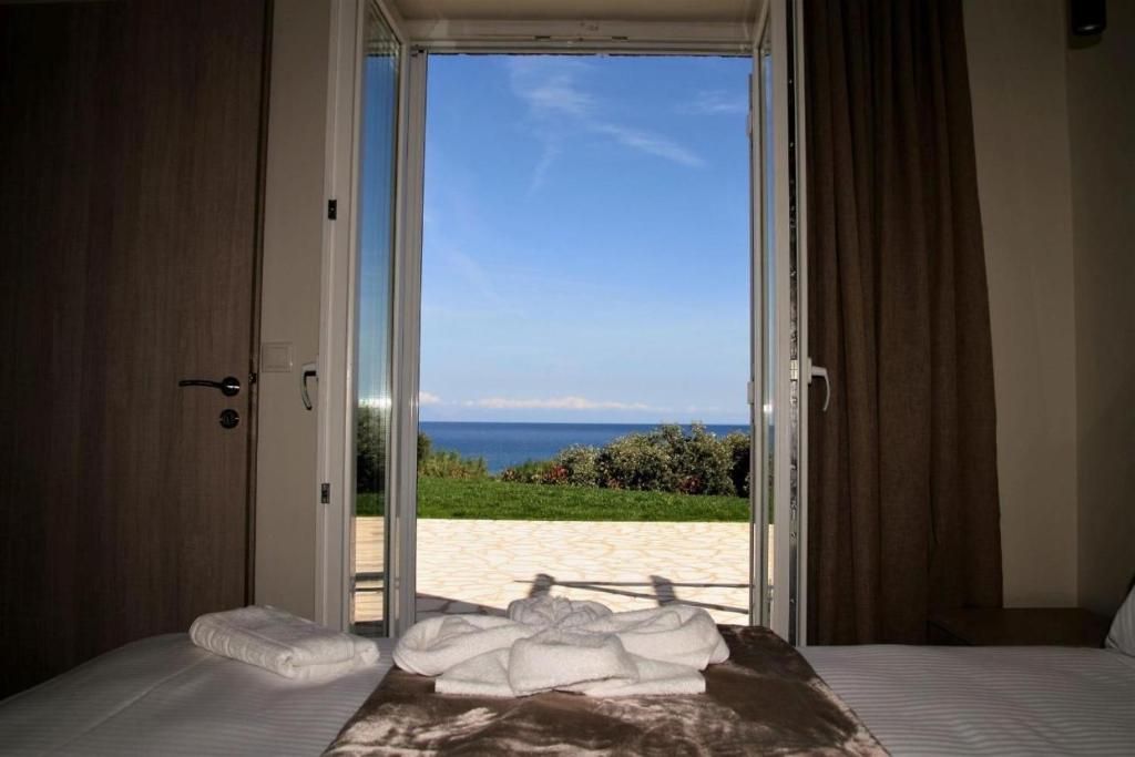 Die Inneneinrichtung ist hell, freundlich und schlicht gehalten und schafft eine angenehme, komfortable Atmosphäre. Das zweistöckige Reihenhaus bietet einen ebenerdigen Zugang und verfügt im Erdgeschoss über einen Wohnbereich mit Sofa für eine Person, eine Küchenzeile, ein Schlafzimmer und ein Bad. Vom Wohn- wie auch vom Schlafzimmer gelangt man direkt auf die überdachte Terrasse, die einen traumhaften Blick in den Garten und auf das Meer eröffnet. Eine Treppe führt ins Obergeschoss, wo ein weiteres Schlafzimmer mit Bad sowie eine großzügige Terrasse mit freiem Panoramablick über die Messinische Bucht zur Verfügung stehen.
