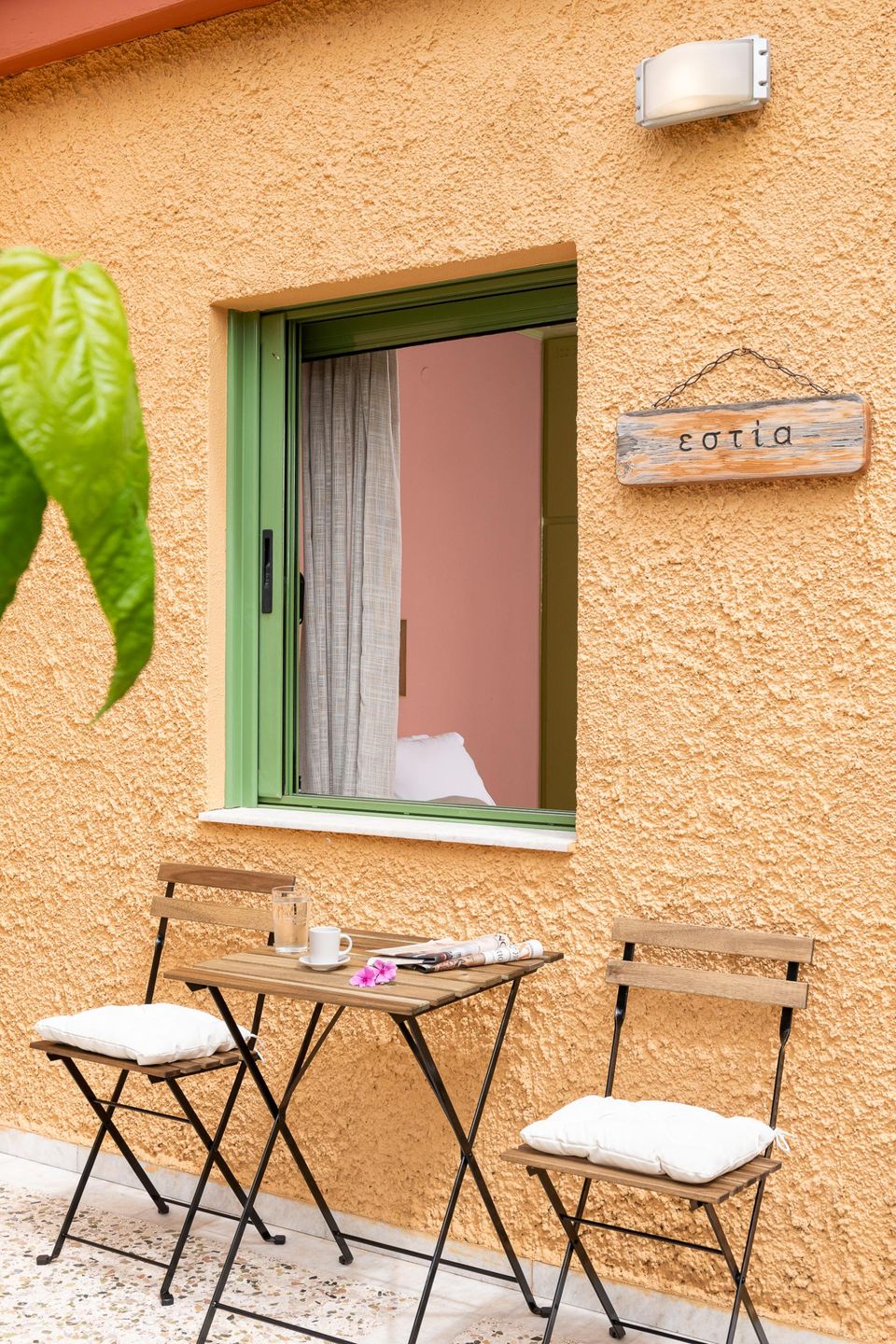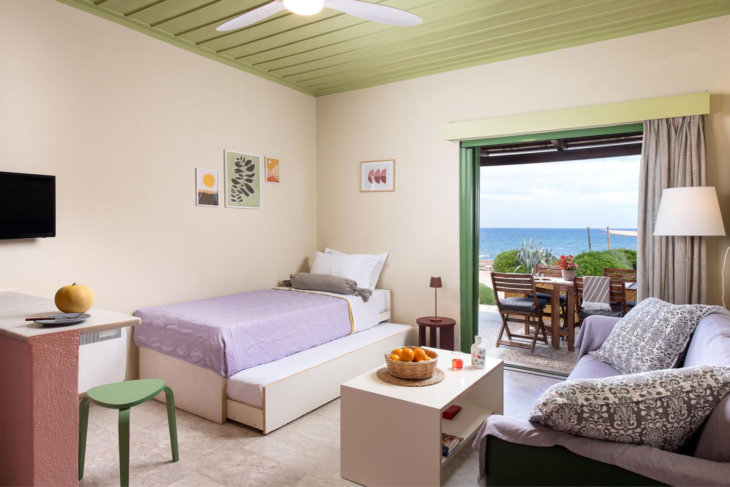 Die 1985 erbauten Esperides-Häuser wurden 2008, 2018 und 2023 renoviert. Die Einrichtung ist schlicht und farbenfroh gestaltet und vermittelt eine warme, gemütliche Atmosphäre. Im Außenbereich dominieren erdige Farben sowie natürliche, lokale Materialien. Von der vorderen Terrasse mit Gartenmöbeln gelangt man direkt in den Garten mit herrlichem Ausblick auf das Meer und die Küstenlandschaft – und mit direktem Zugang zum Wasser. An das Wohnzimmer mit Sofa und zwei Einzelbetten schließen sich die offene Küchenzeile, das Schlafzimmer und das Bad an. Vom Wohnzimmer führt ein direkter Ausgang auf die vordere, überdachte Terrasse mit traumhaftem Meerblick und mediterraner Umgebung, vom Schlafzimmer ein weiterer Ausgang auf die rückwärtige Terrasse.