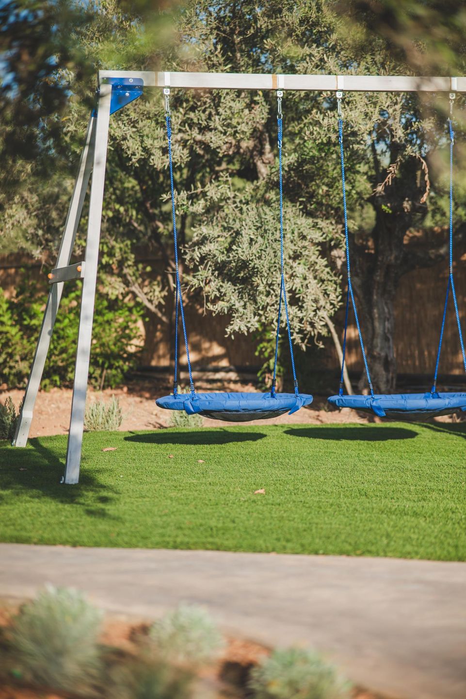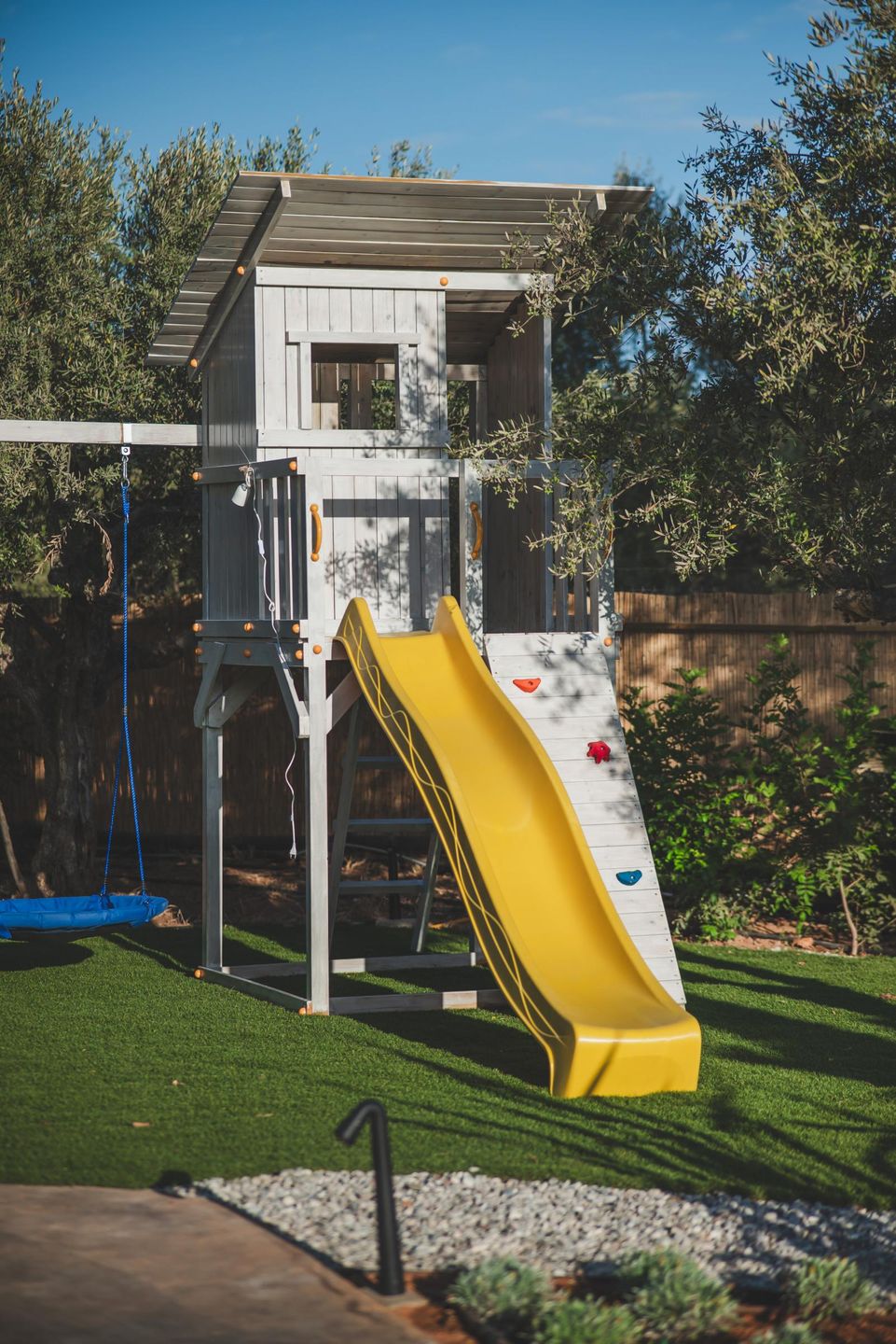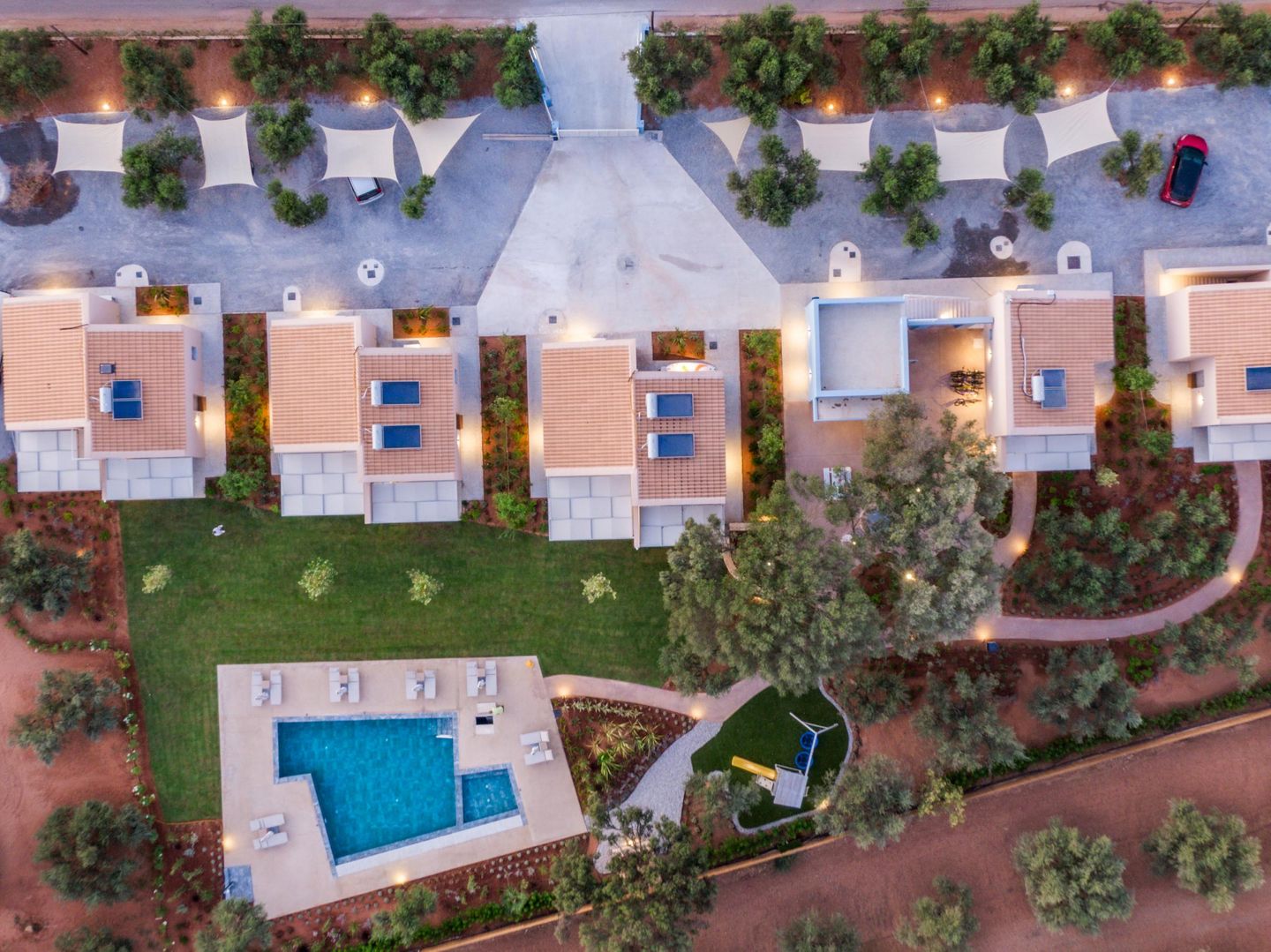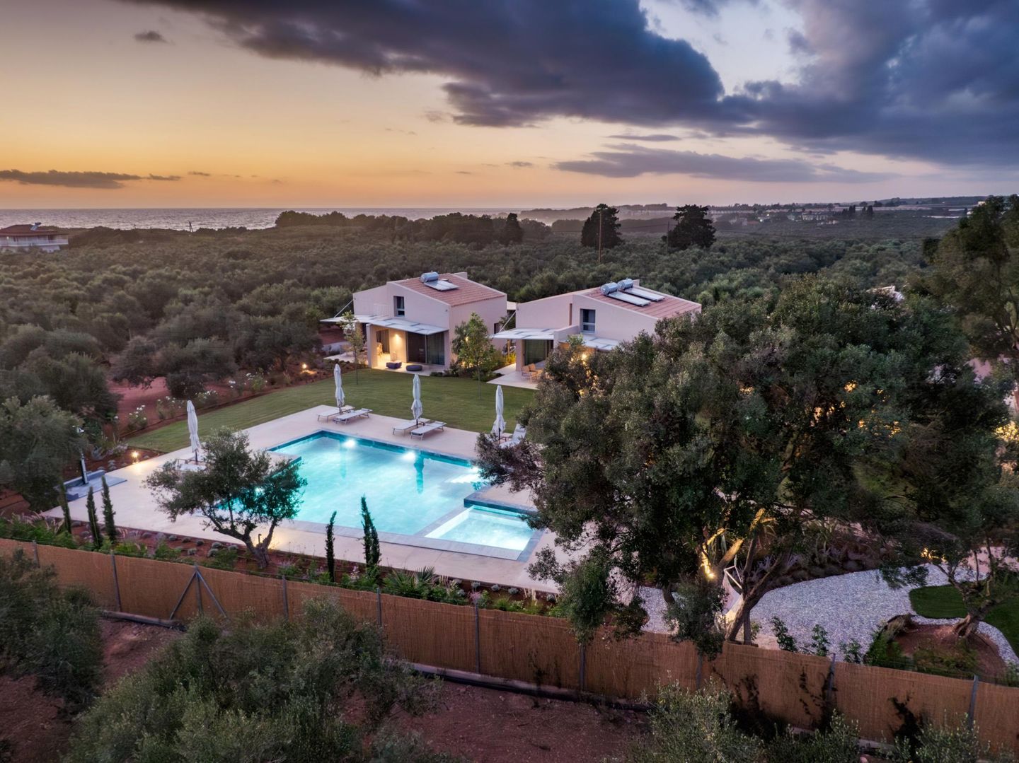 Auf dem abgeschlossenen, 7.000 qm großen Gartengrundstück reihen sich die sechs Häuser in angenehmem Abstand zueinander entlang des gemeinsamen Pools. Ein elegantes Family House, zwei Doppelhäuser mit insgesamt vier charmanten Junior-Doppelhaushälften, ein kleines blaues Haus als Rezeption sowie zwei weitere, kleine Einzelhäuser prägen das Ensemble dieser schönen Ferienhausanlage. Eines der kleinen Einzelhäuser wird im Sommer von der jungen Vermieterfamilie bewohnt.
