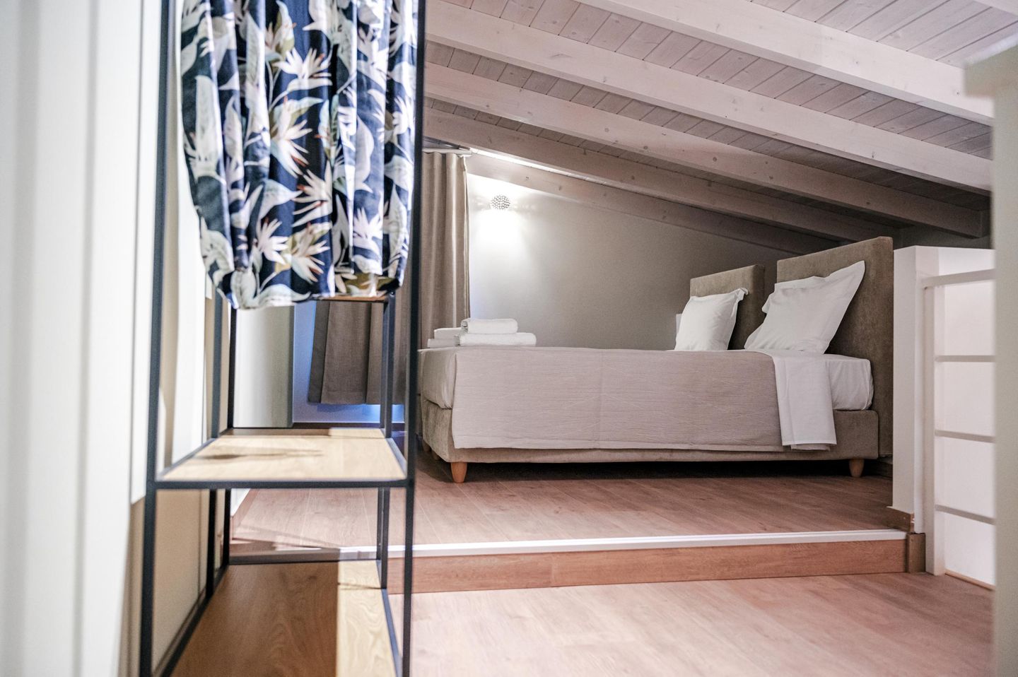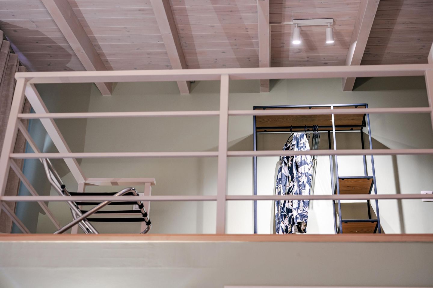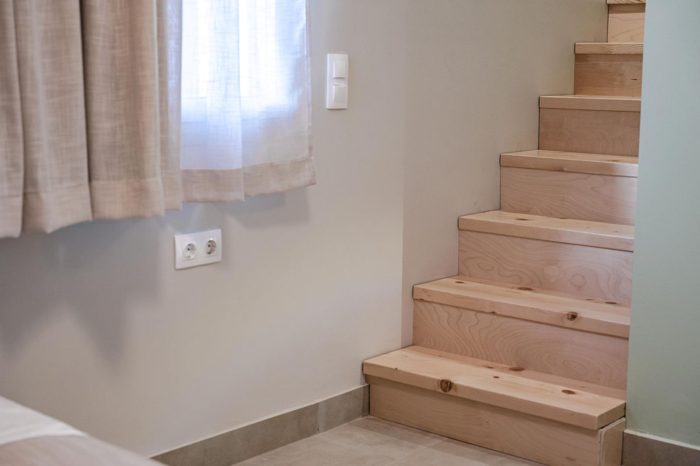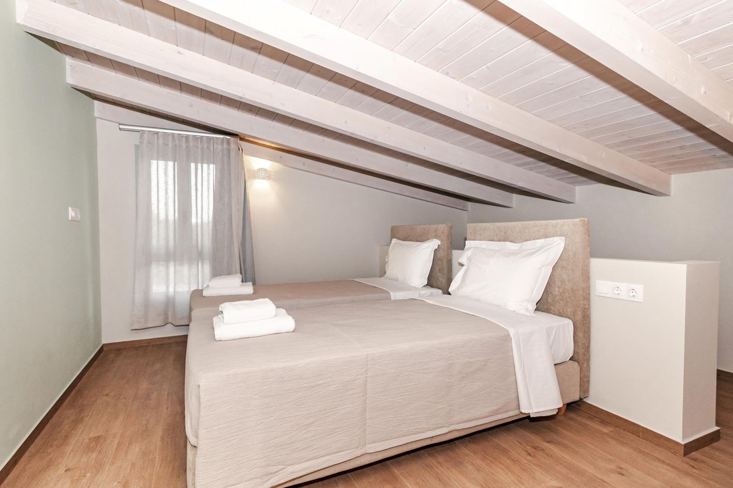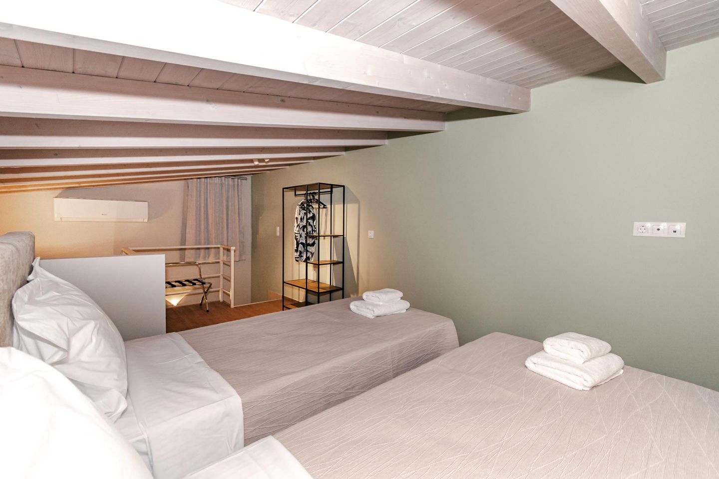 Vom Durchgangszimmer führt eine Treppe ins Obergeschoss. Dort befindet sich – offen gestaltet und unter einer gemütlichen Dachschräge (2,20–1,48 m) – das zweite Schlafzimmer. Zwei Einzelbetten stehen hier bereit und lassen sich auf Wunsch zu einem Doppelbett verbinden.