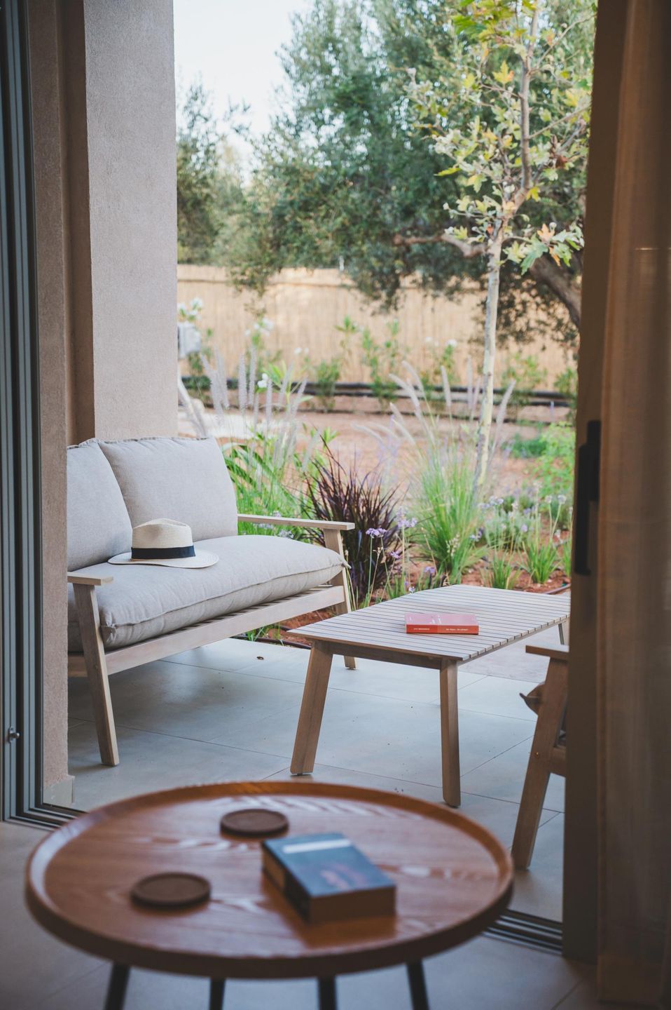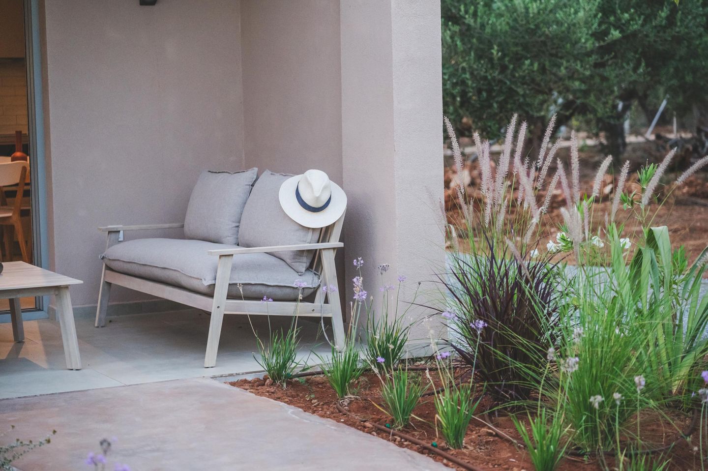 Die überdachte Terrasse vor dem Haus spendet wohltuenden Schatten. Zwei komfortable Sessel und ein Sofa schaffen einen einladenden Ort zum Entspannen und Verweilen.