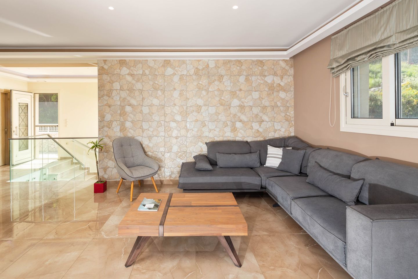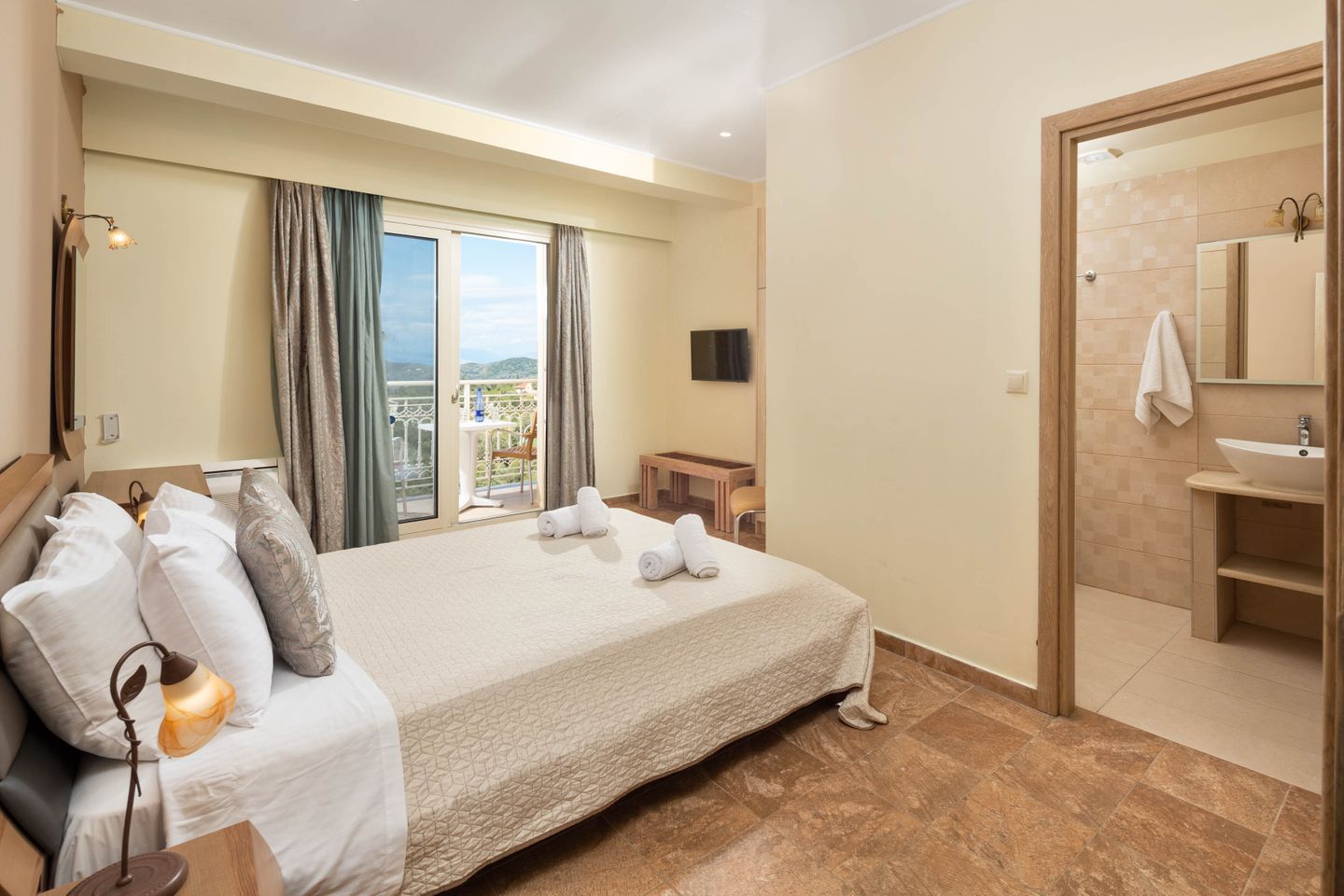 Due to the hillside location the villa MONATRI 1 has a ground level entrance to the upper floor. The spacious and tastefully furnished living/dining area leads to the open kitchen and a guest toilet. There is direct access to a large roofed balcony with a unique view of the green hills, the surrounding landscape and villages of the island. The 3 bedrooms with a private bathroom each are one level further down. Two of the bedrooms have direct access to a large balcony with a great view. Each of the bedrooms is fitted with a SAT TV and there is also a separate television room with direct access to the pool area on the same floor.