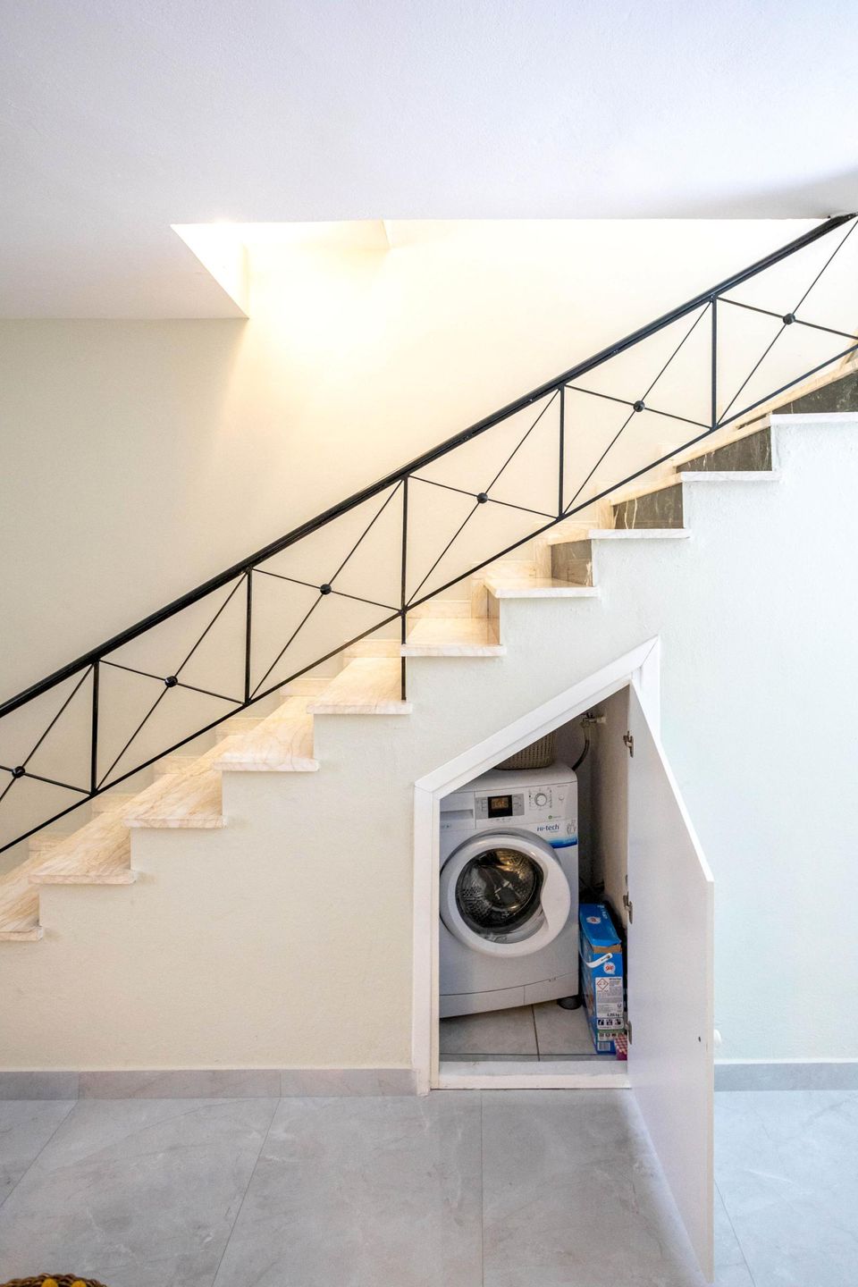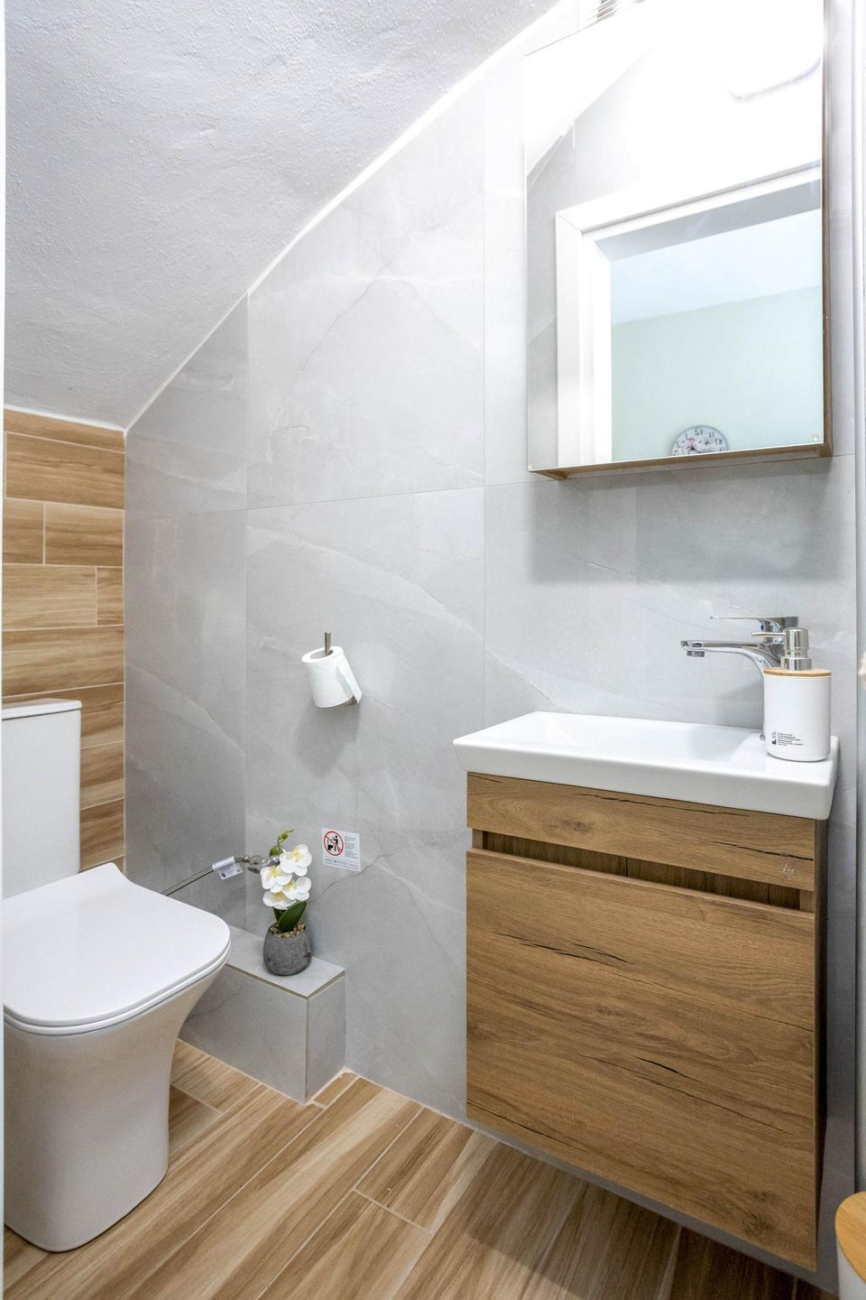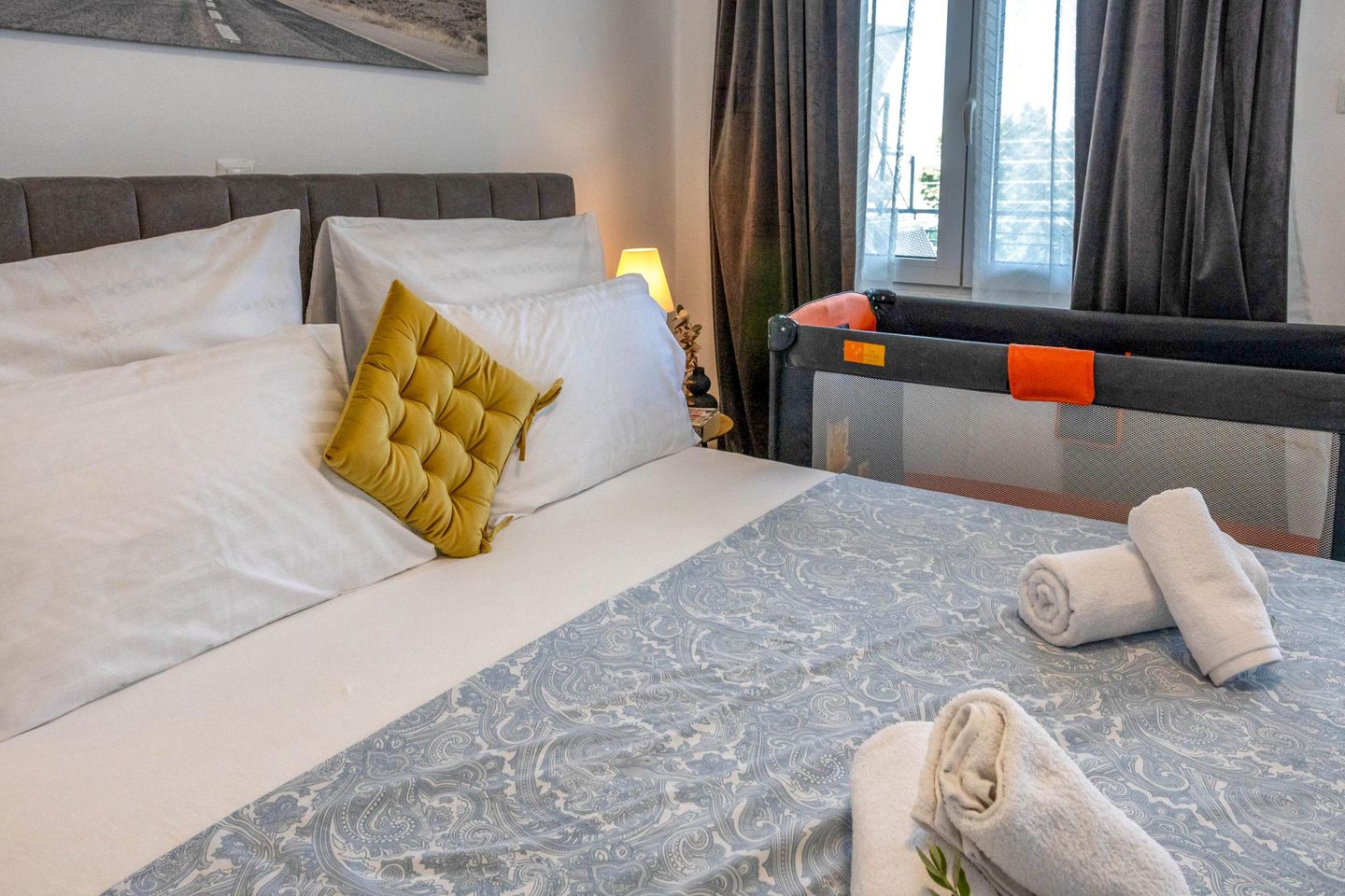 The well-kept three-storey holiday house LITSA (left half of the house) consists of the 1st and 2nd floor of the main building and the small granny annexe on the ground floor. Access to the main building is via some stairs. Adjoining to the living room on the first floor is the semi-open kitchen and the guest toilet. From the living room you have access to a roofed front terrace. On the second floor there are 2 bedrooms and the shared bath. One of the bedrooms has direct access to a private front terrace with a sea view. The second bedroom has a small balcony to the rear.