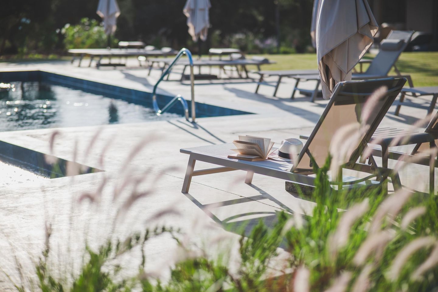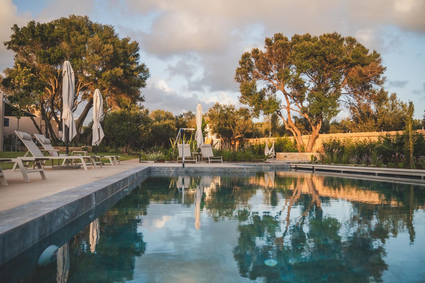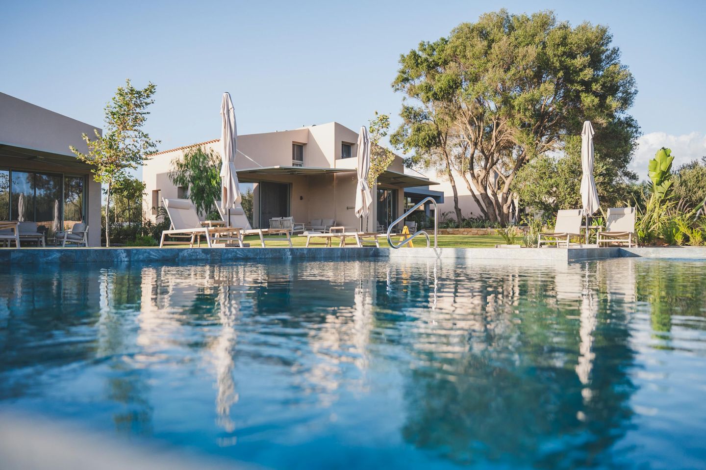 On the enclosed 7,000 sqm garden property, the six houses are arranged at a pleasant distance from one another along the shared pool. The ensemble includes an elegant Family House, two semi-detached buildings with a total of four charming Junior Houses, a small blue house serving as reception, and two additional small single houses. One of the small single houses is occupied by the young owner family during the summer season.